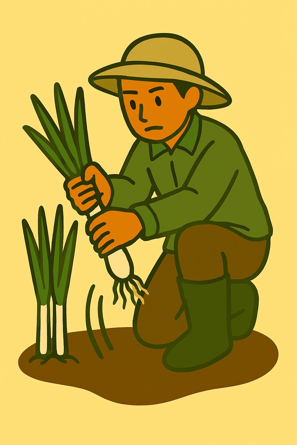 農作業 人農作業ネギ 「長ネギ」×「農業」×「収穫」 長ネギを収穫する人 15/09/2025 15/09/2025 Facebook postはてブLINEPocketFeedly 長ネギの土寄せを鍬で崩す人 長ネギを収穫するために、土寄せしてある長ネギの土を鍬を使って崩している女性のイラストです。 タオルを首元にまいて、土を動かす力仕事です。それでも微笑みながら行う女性の姿から、大変な仕事の中から垣間見える収穫の喜びが感じられる一枚です。 長ネギを収穫する人 上記のイラストから続く作業で、土を崩した長ネギを引き抜いて、土を落とし状態を品定めしている人のイラストです。 上のイラストの女性と違って、こちらの男性は引き締まった顔でネギを見つめています。品質管理を行っている人にも見ることができます。 Facebook postはてブLINEPocketFeedly