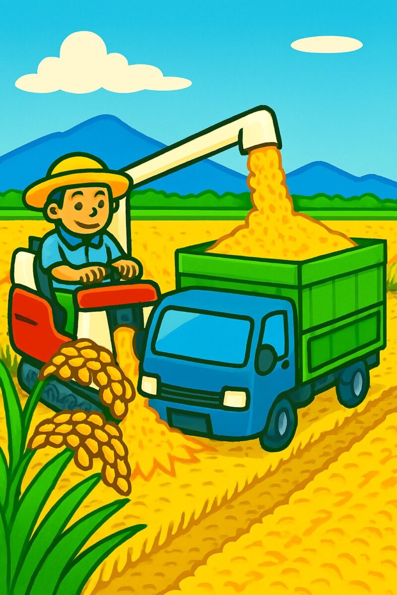 農作業 人農作業秋 「稲」×「収穫」 稲の収穫をする男 11/10/2025 11/10/2025 Facebook postはてブLINEPocketFeedly 稲の実りを眺める男 金色に輝き実ったイネを眺めて、収穫の機運を高めている男性の後ろ姿の様子のイラストです。順当に育ち、いざ米として取り扱える収穫期の今をしみじみと感じている哀愁が、その背中から感じられる一枚です。 収穫しようとコンバインを乗ってきた男 機運が高まりいざ稲を刈ろうと、コンバインに乗って田んぼ絵侵入した男性のイラストです。今か今かとそのハンドルに力がみなぎっている様子がうかがえる一枚です。 機械で稲を収穫している男 ついに稲刈りが始まったイラストです。意気揚々と笑みを浮かべコンバインを運転する男性の一枚です。 収穫した稲穂をトラックに積み込んでいる男 収穫したコメをトラックに流しいれて積み込んでいる様子のイラストです。満足げに映る表情と、トラックに満載に積み上げられるコメの様子から、いい収穫ができたのだろうと感じる一枚です。 Facebook postはてブLINEPocketFeedly
