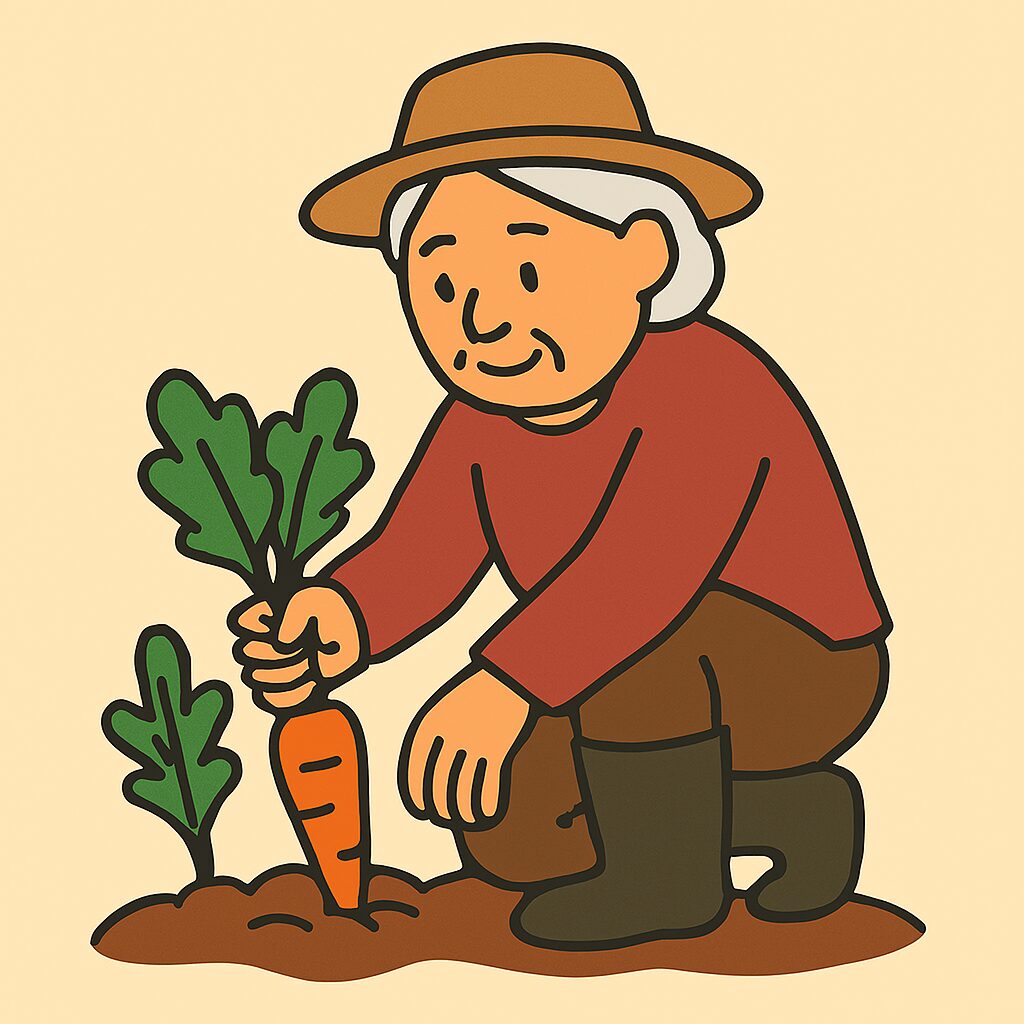 This illustration depicts an old man pulling up a large turnip. It captures a restrained expression on the old man's face, who appears to be smiling contentedly as he successfully harvests the turnip that has grown well.