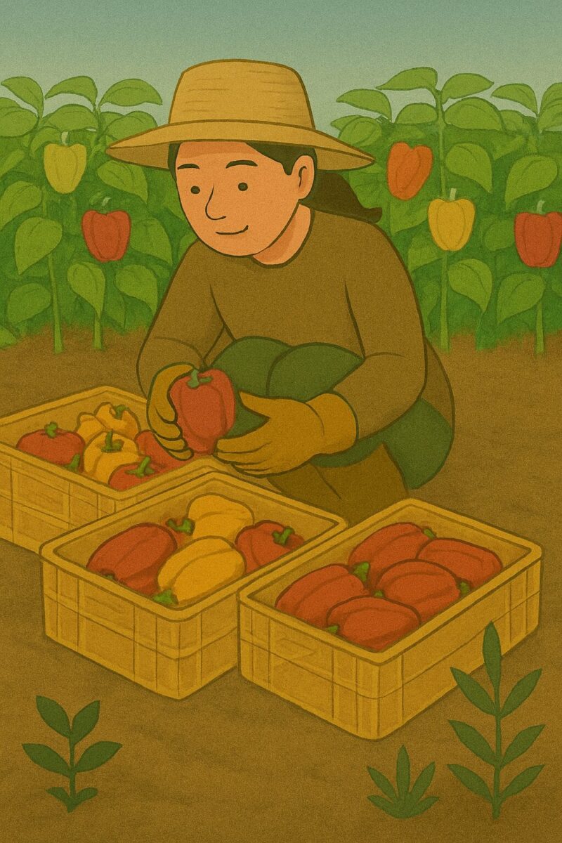 An illustration showing a paprika farmer checking the size of harvested paprika and sorting them into containers by size. They appear somewhat satisfied, working with a smile.