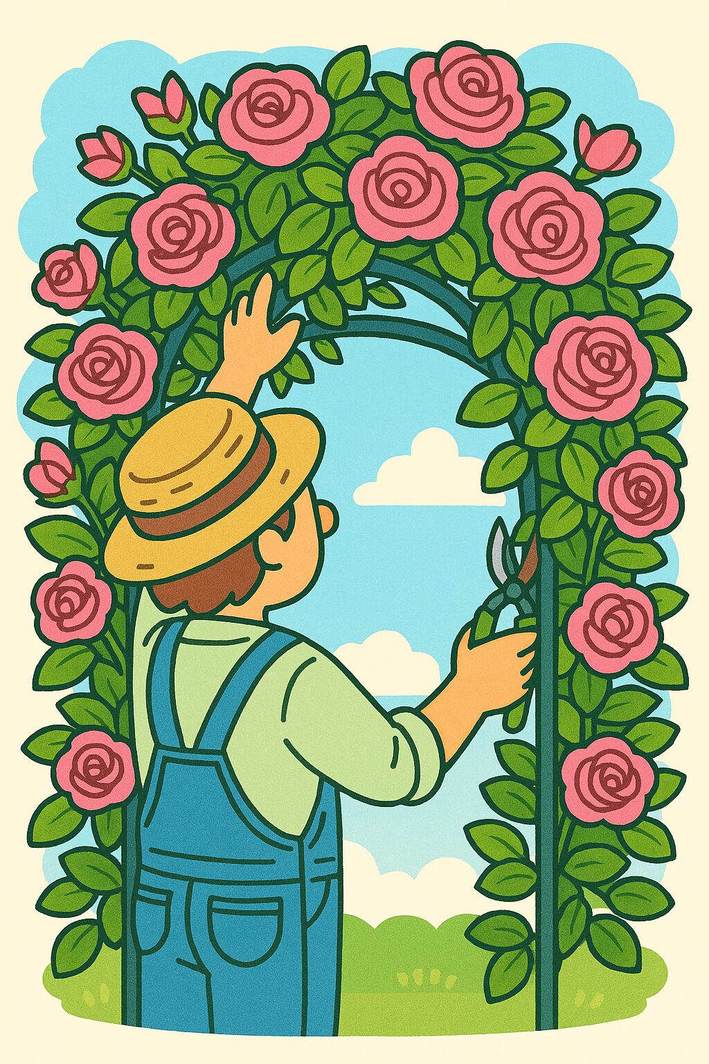 This illustration depicts someone pruning a rose bush to shape its form. While the composition appears quite simple for an actual rose, as an illustration it clearly shows a single-stemmed form bearing a splendid red bloom, with a promising bud developing behind it.