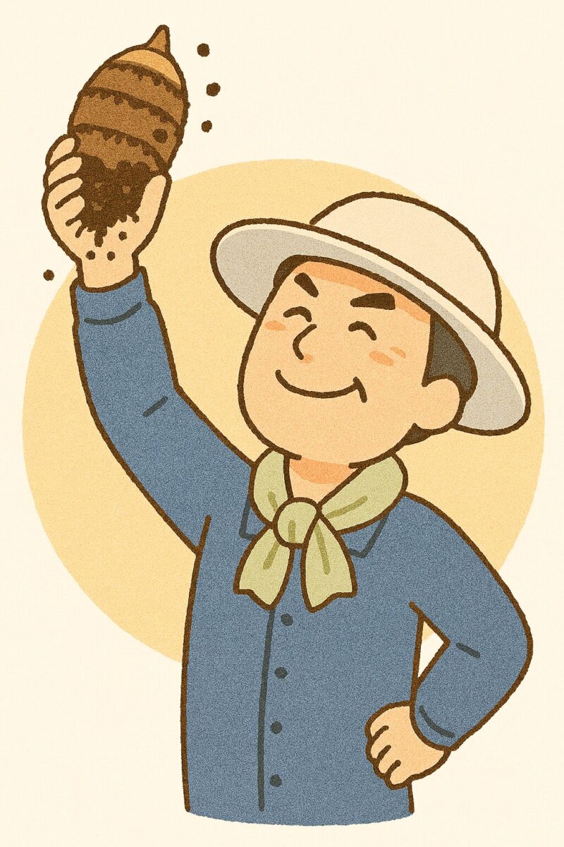 An illustration of a man digging up taro roots with a shovel. His face is tense, and the moment captures him exerting all his strength to pull them up.