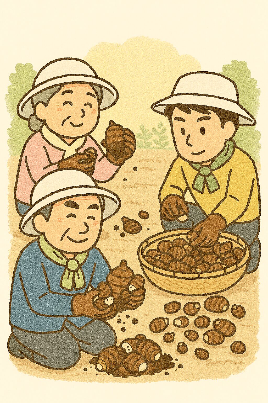 This illustration shows the workspace of a taro farmer sorting harvested taro into parent tubers and baby tubers. The baby tubers, primarily for commercial shipment, are being separated into baskets. The large parent tuber in the center is stored in front of the grandfather for personal consumption, not for shipment. The grandmother at the very back is loosening and removing the larger roots and soil. This is a scene from the busy shipping season at a taro farm, showing one of the adjustment tasks being performed.