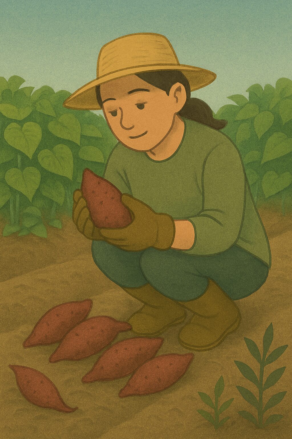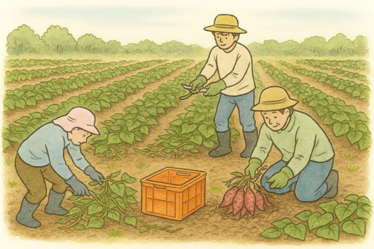 This illustration shows the initial sorting process before placing harvested sweet potatoes into containers. The woman in the foreground gathers and piles up excess vines, while the man is in the act of separating the connected sweet potatoes into individual ones. The man in the background is cleaning the scissors he will use, preparing for the task. It captures a scene from the harvest sorting process at a sweet potato farm.