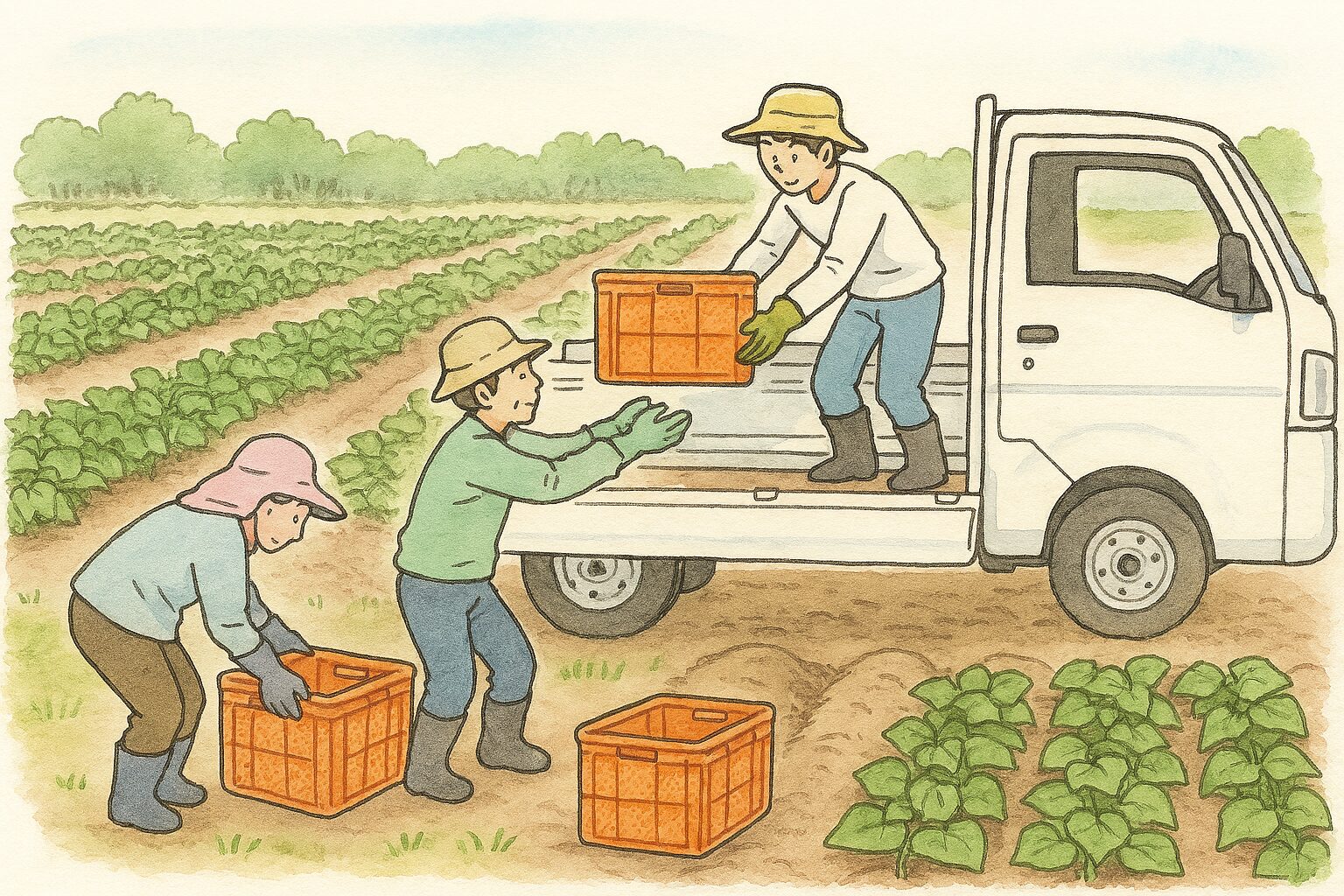 An illustration showing someone preparing for harvest by unloading sweet potatoes from the bed of a pickup truck into harvest containers.