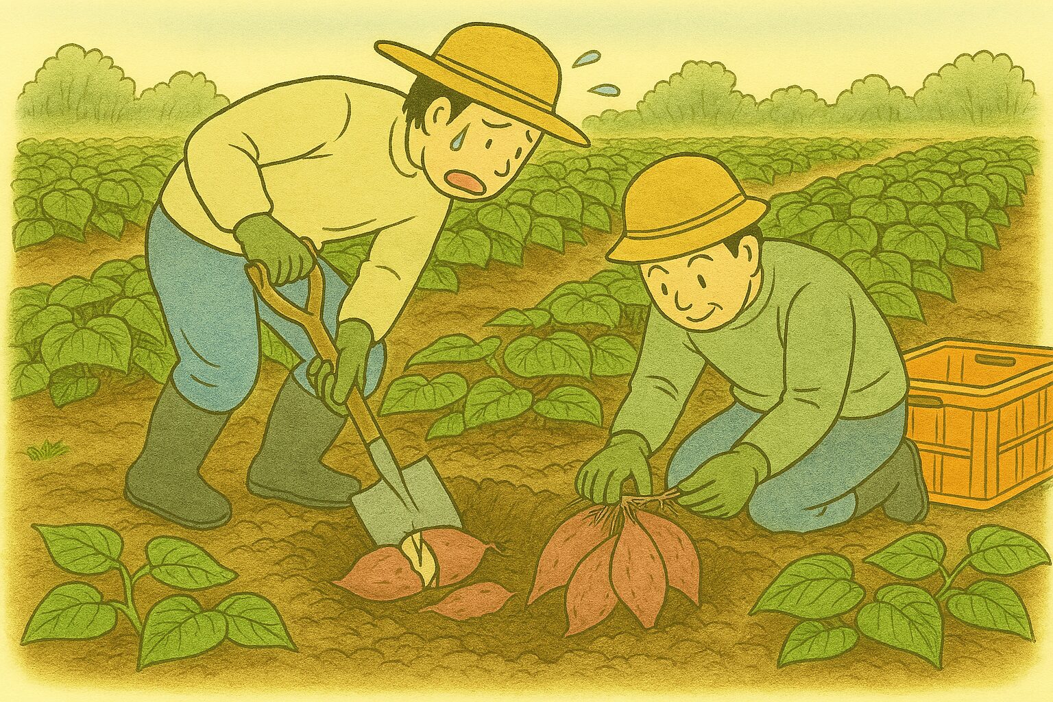 This illustration depicts sweet potato farmers harvesting sweet potatoes by digging them up with shovels. It shows a man holding a shovel loosening the surrounding soil, while an elderly man searches for sweet potatoes by hand.