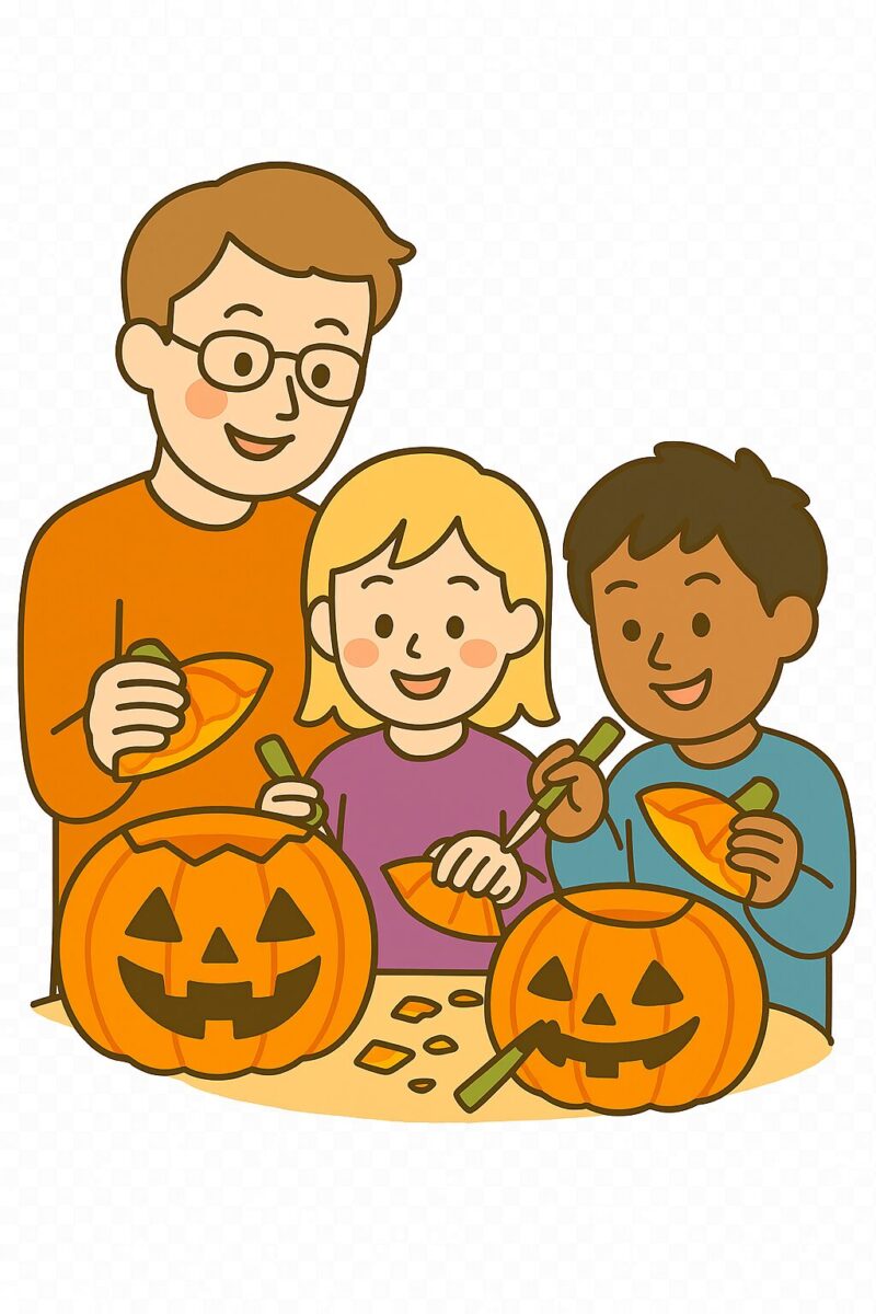 An illustration depicting two children making jack-o'-lanterns under adult supervision. They appear to be enjoying themselves in a lively setting like a cultural school, with the carved-out pumpkin pieces adding a sense of realism to the scene.