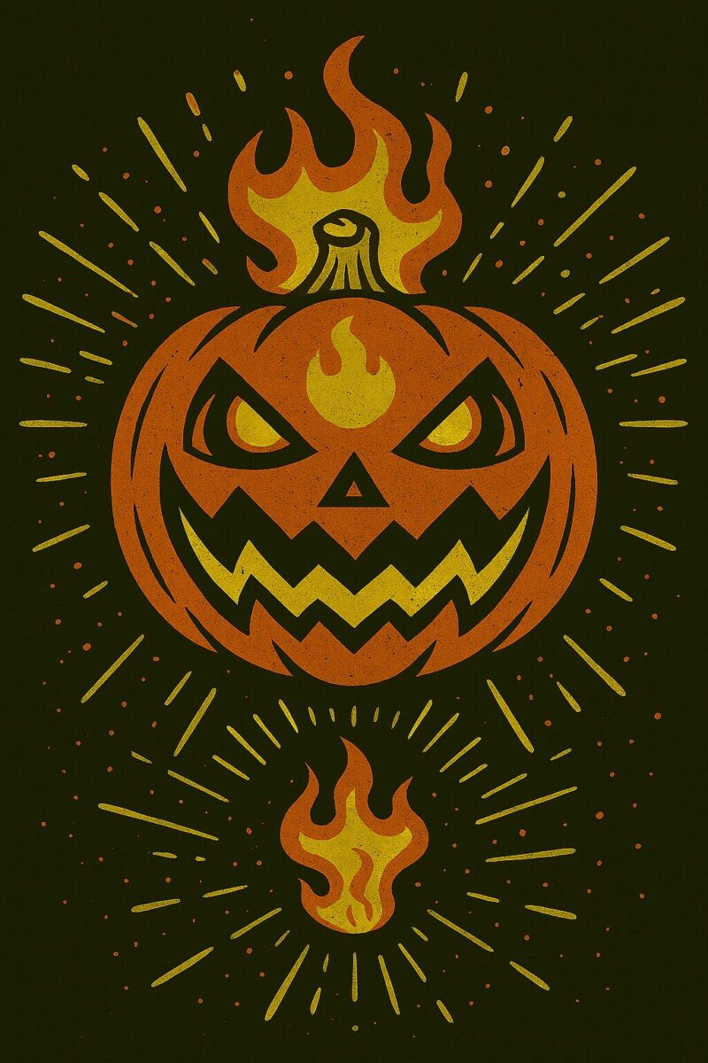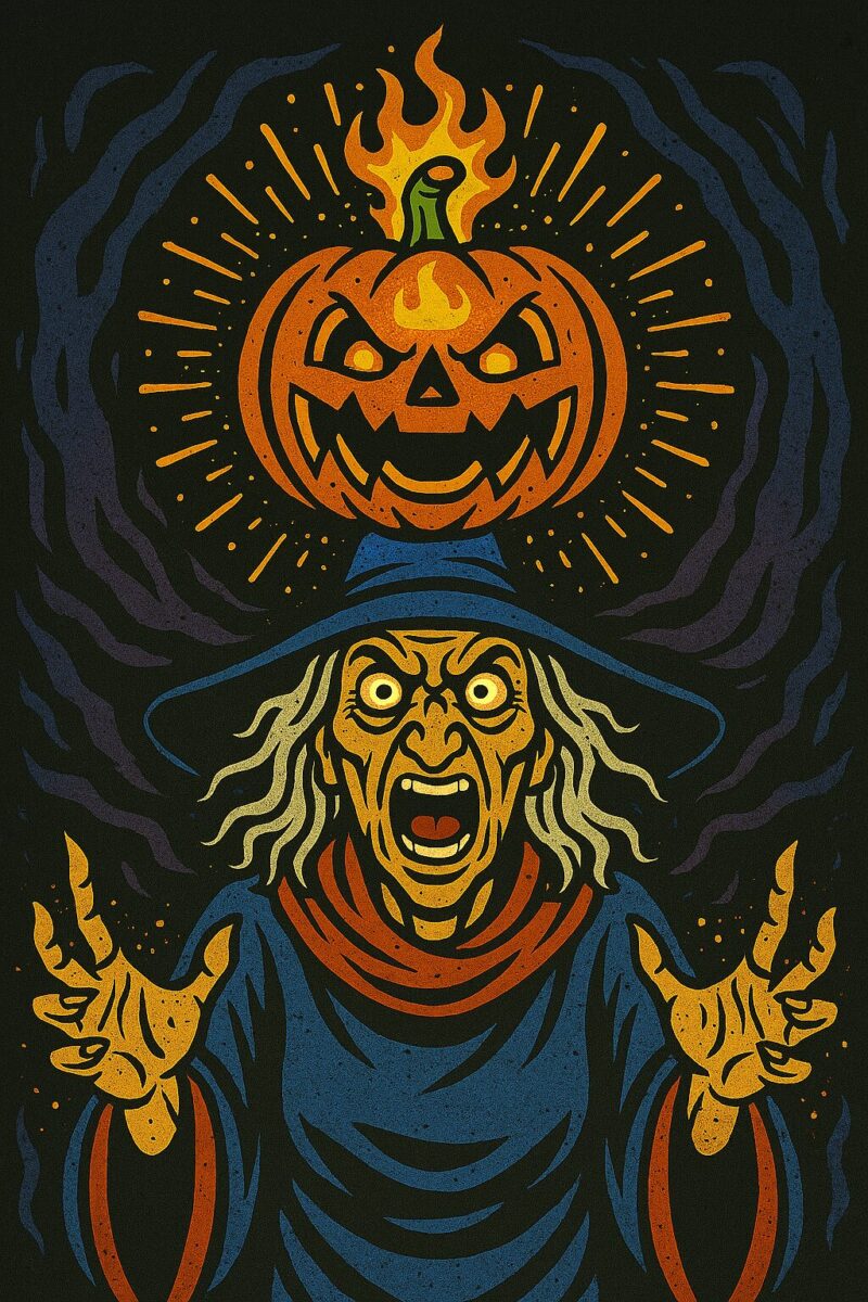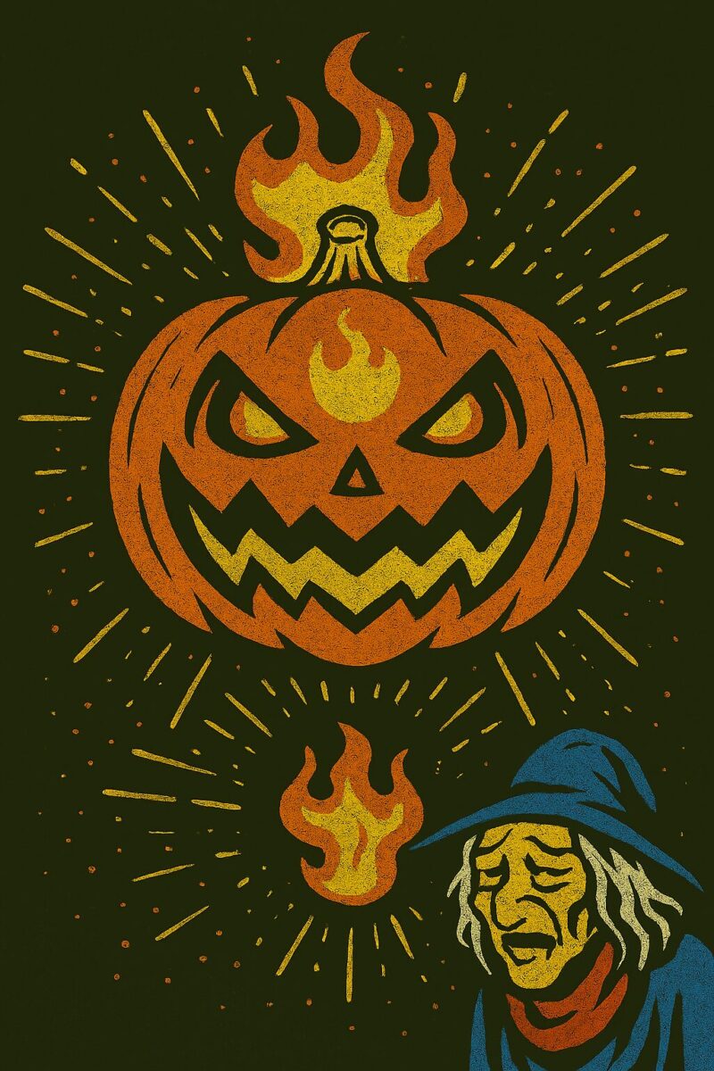 This illustration depicts a Jack-o'-lantern awakened by a witch's spell, possessing both will and power. Its eyes burn with an intense light, radiating a formidable presence. In the shadows, the witch's very soul is being consumed, leaving her visibly exhausted and on the verge of collapse.