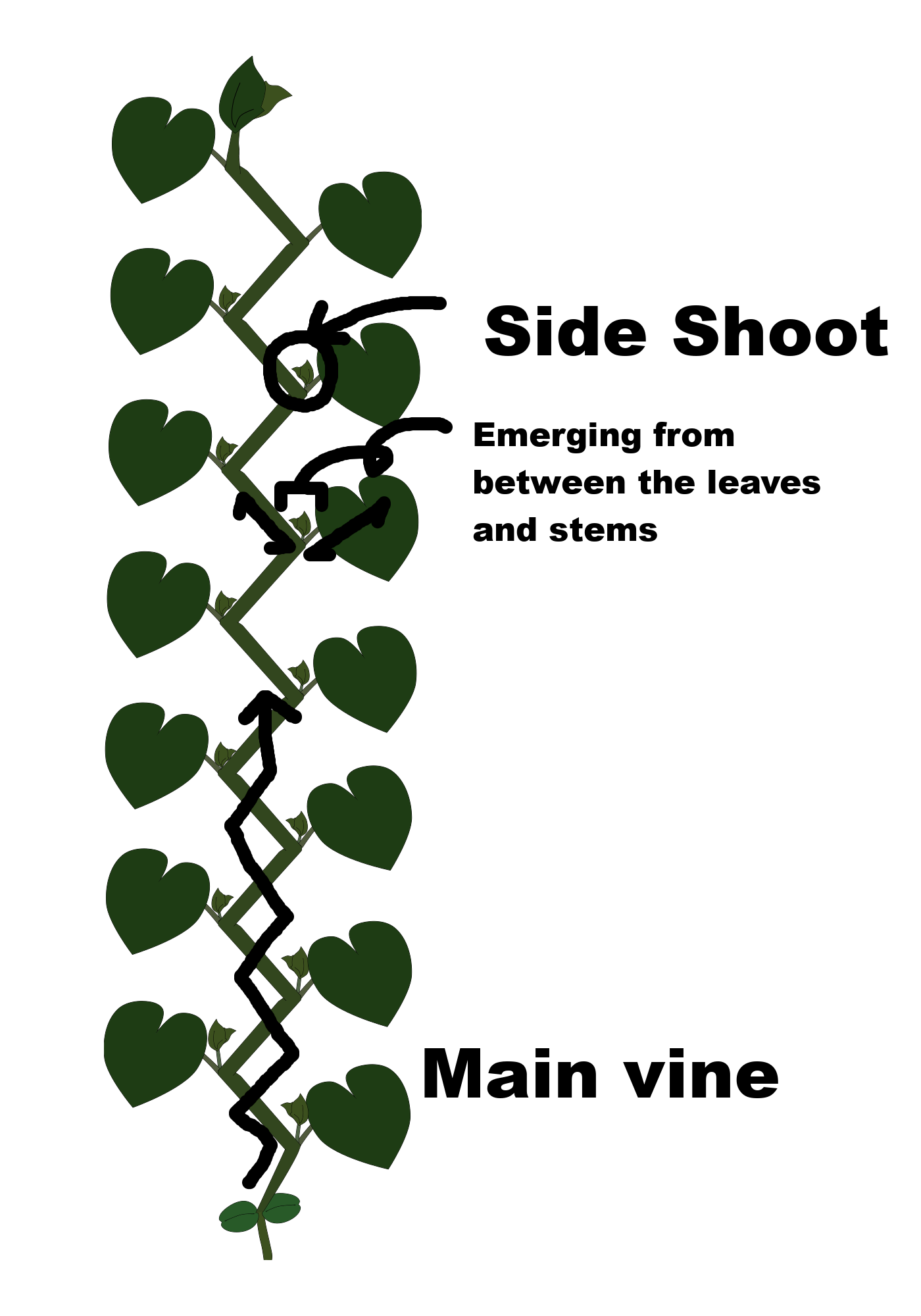 Leaves grow from each node along the main stem extending from the central cotyledons. As shown in the diagram above, axillary buds develop between the stem and these leaves. These buds elongate and develop into side branches (daughter vines).