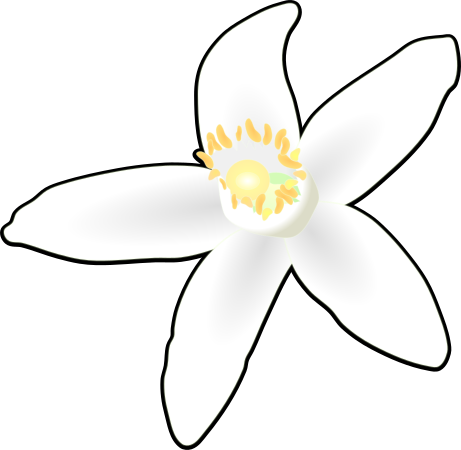 オレンジの花と葉のイラストです。可憐な白い花と羽根のようね葉柄を持つ葉。特にビターオレンジの花は乾燥させ、ハーブティーにも用いられます。