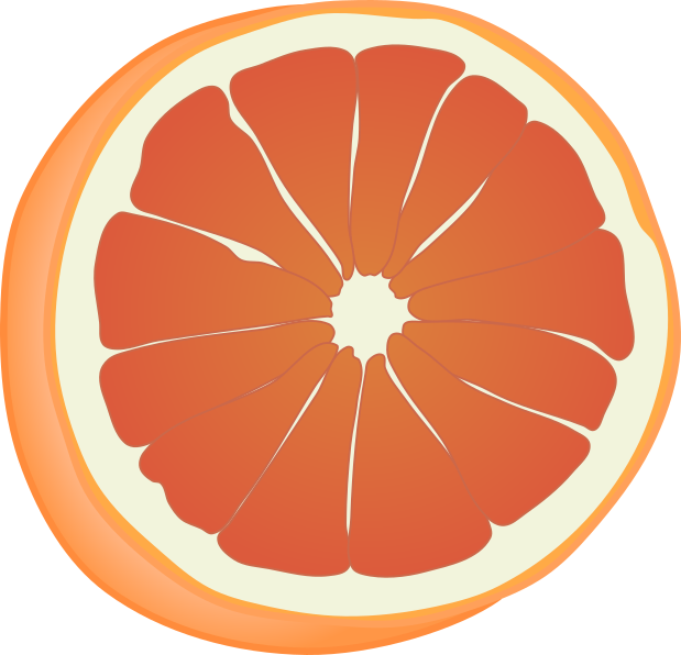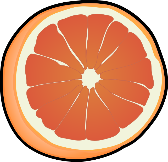外側の外皮が淡いオレンジ色で、切断面はピンクからルビーレッド色の果肉がみずみずしく彩るピンクグレープフルーツの断面のイラストです。