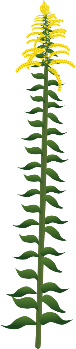 高く伸びて黄色い花を咲かせるセイタカアワダチソウのイラストです。厄介な雑草として知られている野草で手つかずの土地や土手で群生しています。北米から流入し帰化した外来植物のうち、強いアレロパシーもあり侵略的外来種ワースト100にも選出されている植物です。薬効もありハーブとして利用されることもあります。